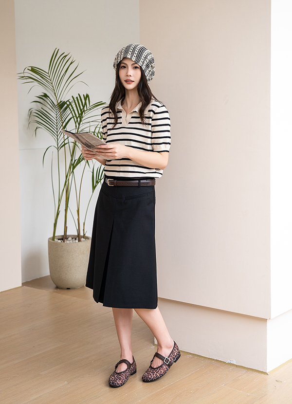 高腰A字剪裁搭配細皮帶,明確勾勒出腰線,讓平底鞋穿搭也能保有良好的身材比例;