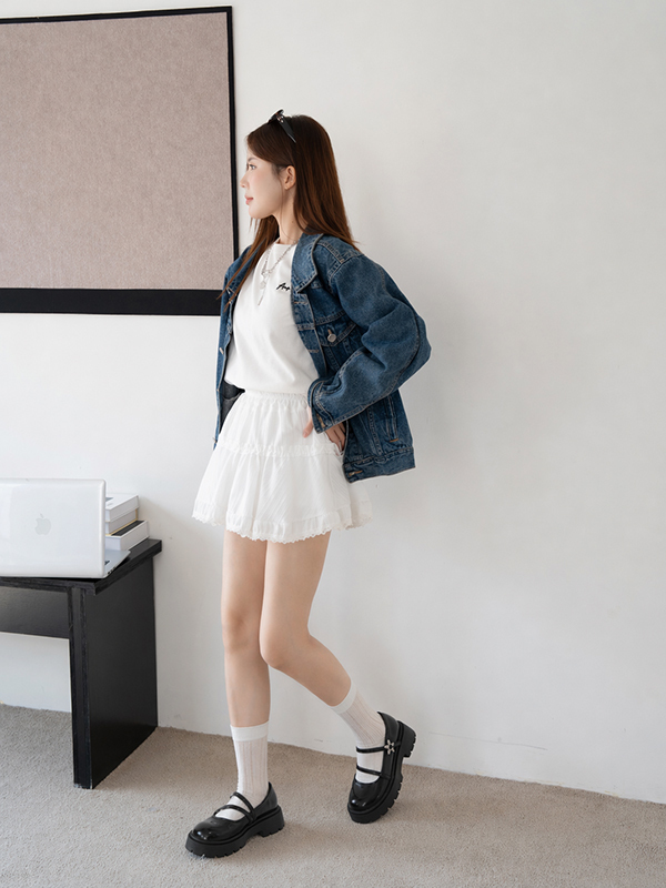 甜酷少女風→ 白色蛋糕短裙與鞋款的甜美元素呼應,同時利用裙長展現腿部比例。