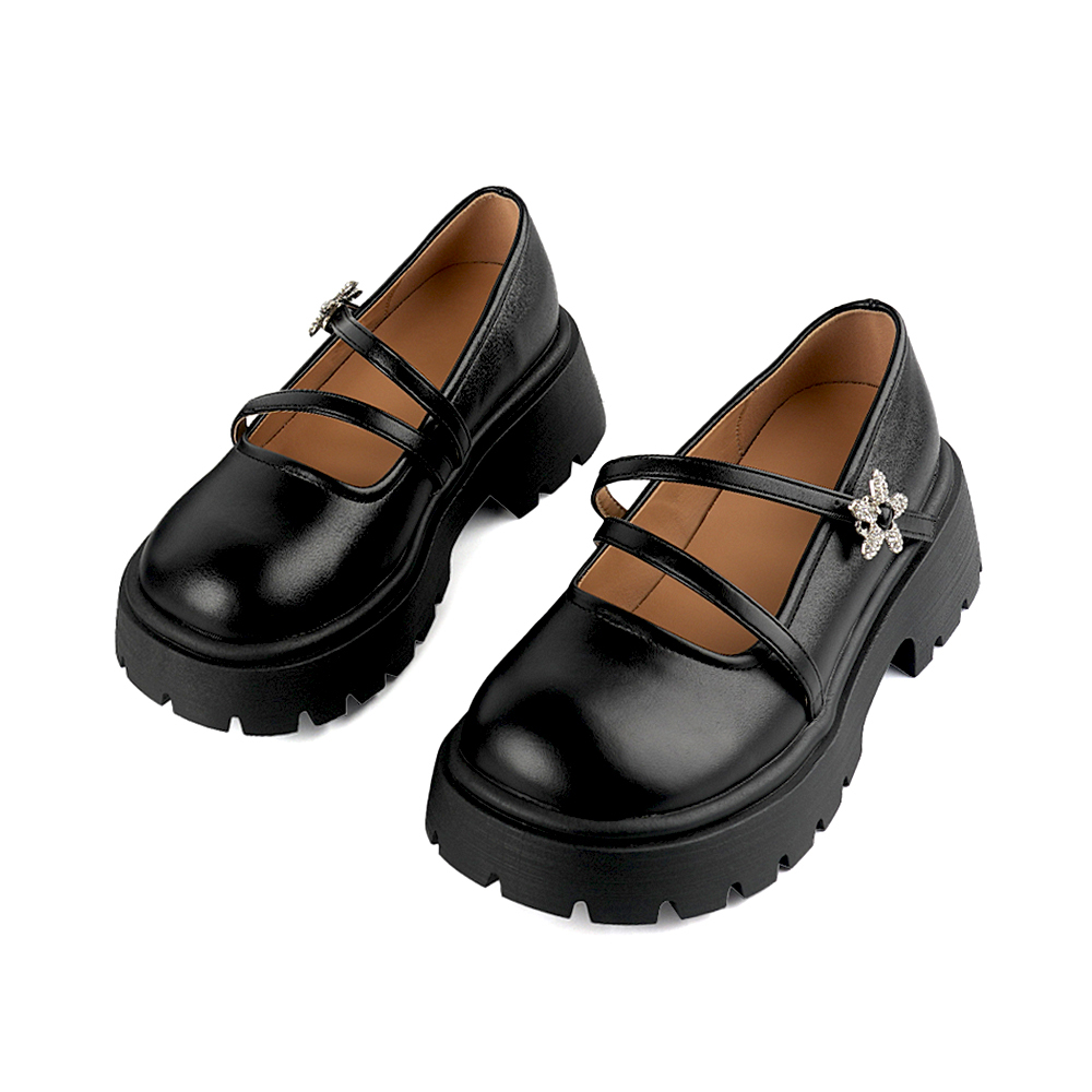 透過厚實的鞋底與精緻的閃鑽小花釦飾,在率性與優雅之間取得平衡,是極具存在感的造型單品。