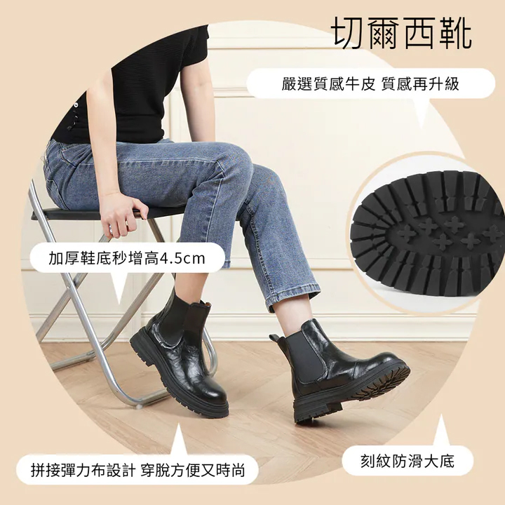 延續秋冬的街頭酷感風潮,這款切爾西靴以真皮拼接彈力布打造俐落線條,展現率性魅力。柔韌細緻的牛皮鞋面結合彈性布料結構,穿脫輕鬆又貼合腳型,兼顧時尚與實穿性。前高後高的厚底設計,在穩定腳步的同時悄悄拉長腿部比例,輕鬆營造「微增高」效果。不論搭配皮褲、寬褲或長裙,都能穿出自信的街頭氣場與高質感時髦造型。(點我)短靴 真皮拼接彈布厚底切爾西靴