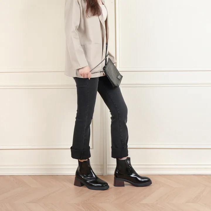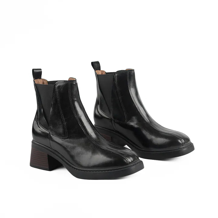 今年秋冬必收的經典黑色短靴,以真牛皮鞋面呈現自然光澤與細緻質感,展現俐落又幹練的都會氛圍。方頭設計修飾腳型比例,搭配木紋質感粗跟與耐磨橡膠鞋底,行走間穩定又舒適。跟高約6cm悄悄拉長腿部線條,營造修長俐落的身形比例。不論搭配西裝褲、牛仔褲或長洋裝,都能輕鬆駕馭,是秋冬衣櫃中最百搭的萬用短靴。
