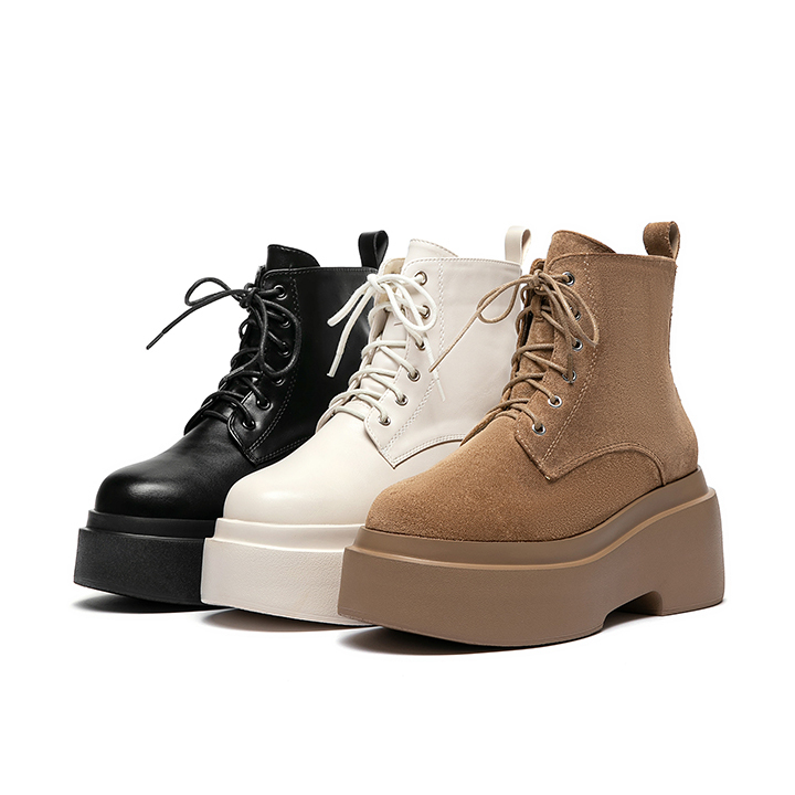 這雙加厚鬆糕底綁帶短靴,是秋冬造型中的「顯高神鞋」。後高約8cm的厚底比例,瞬間拉長腿部線條,打造修長高挑的完美比例。圓頭楦型讓腳趾舒適不擠壓,結合經典綁帶造型,增添帥氣街頭感與率性氣勢。鞋底使用輕量發泡材質,行走穩定又不笨重,兼具舒適與時尚,是秋冬必備的百搭厚底短靴。