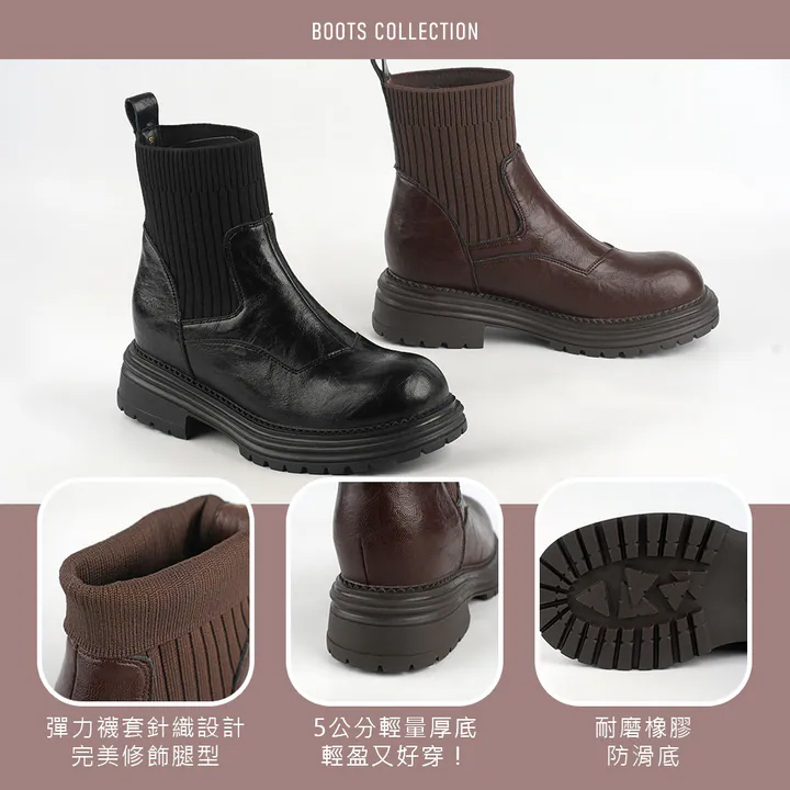這款圓頭針織襪套短靴融合時尚與舒適於一身,異材質拼接設計展現層次感,低調卻充滿細節。彈力針織筒身柔軟貼合腿型,穿上即能修飾小腿曲線,打造俐落筆直的視覺比例。5cm輕量厚底設計,行走更穩定,長時間穿著也不易疲勞。從日常通勤到週末出遊都能輕鬆搭配,是秋冬穿搭中不可或缺的時髦襪套靴代表,展現自信與優雅魅力。