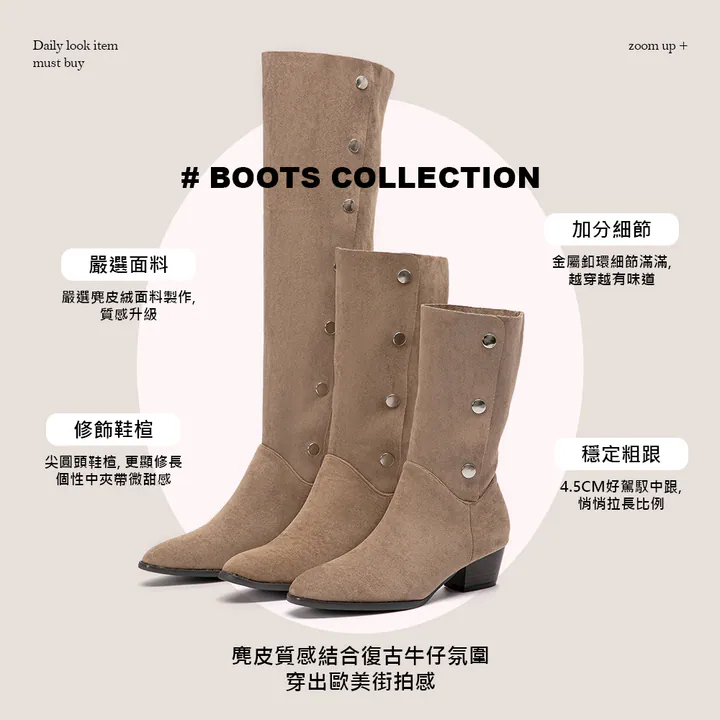 這雙造型釦環排釦過膝靴以柔軟的麂皮絨面材質打造,呈現細膩高質感,穿上立即散發復古優雅氣息。尖圓頭鞋楦在個性與柔美之間取得完美平衡,搭配金屬釦環與排釦設計,細節滿滿、越穿越有味道。中跟高度約4.5cm,讓雙腿比例悄悄被拉長,同時保有穩定的行走感。無論搭配短裙、針織洋裝或長版外套,都能展現俐落又不失女人味的秋冬時尚氛圍,是衣櫃裡不可或缺的一雙百搭長靴。